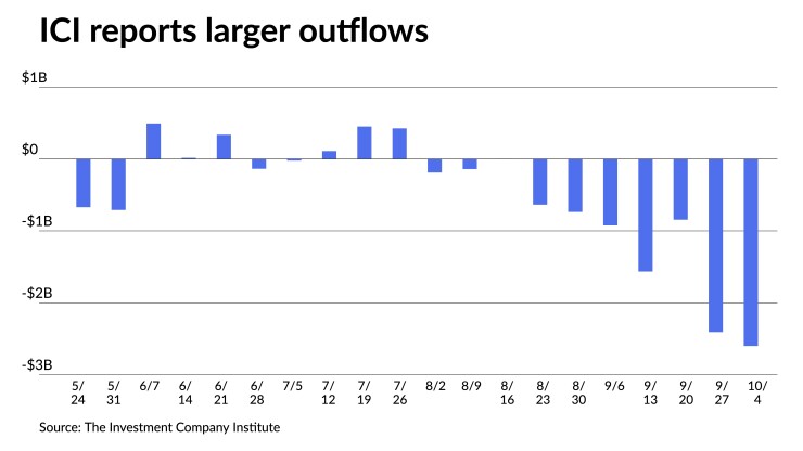 Municipal mutual fund losses continued last week as the Investment Company Institute Wednesday reported investors pulled $2.6 billion from the funds in the week ending Oct. 4 after $2.407 million of outflows the previous week. This is the second-largest outflow cycle of 2023, only being surpassed by outflows of $3.157 billion for the week ending Jan. 4.