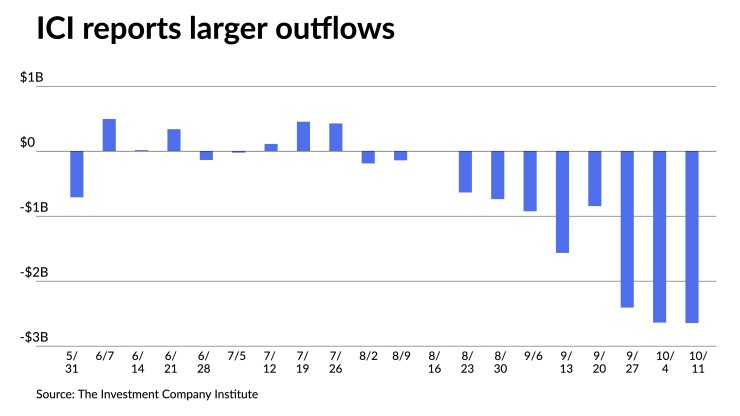 Municipal mutual fund losses continued last week as the Investment Company Institute Wednesday reported investors pulled $2.645 billion from the funds in the week ending Oct. 11 after $2.638 million of outflows the previous week. This is the second-largest outflow cycle of 2023, only being surpassed by outflows of $3.157 billion for the week ending Jan. 4.
