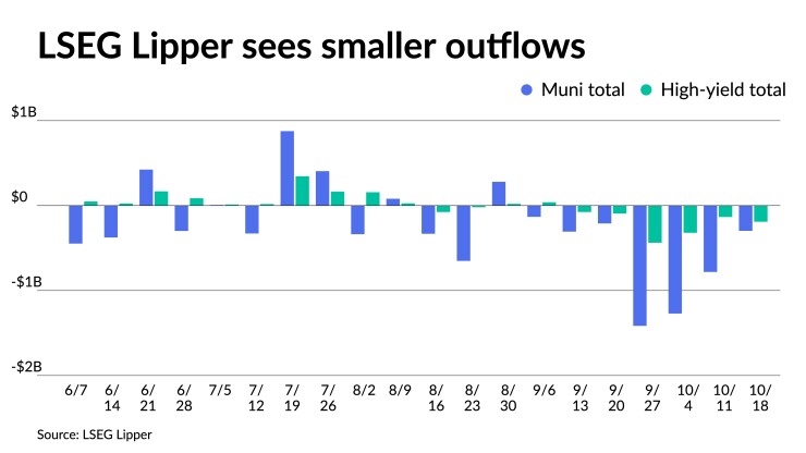 LSEG Lipper data Thursday reported $297 million of outflows from municipal bond mutual funds for the week ending Wednesday after $780.1 million of outflows the week prior.