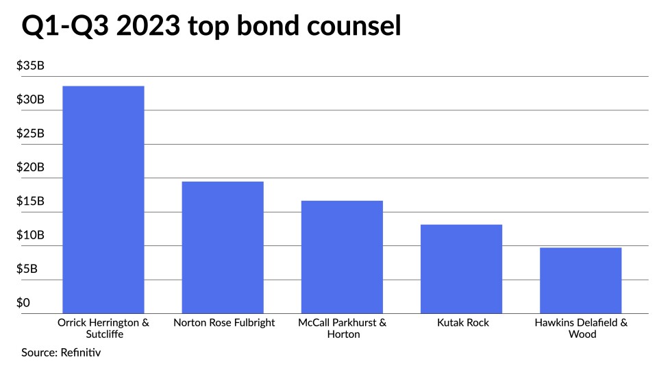 The top bond counsel firms combined for a total of $265.112 billion in 5,327 transactions during the first three quarters of 2023, down from the $291.768 billion in 6,400 deals over the same period in 2022.