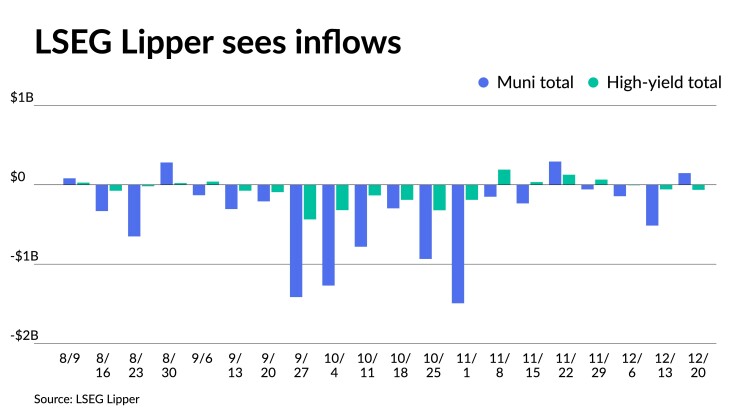 The end of the outflow cycle could be near. LSEG Lipper reported Thursday that investors added $147 million to muni mutual funds for the week ending Wednesday after outflows of $514.5 million the week prior.