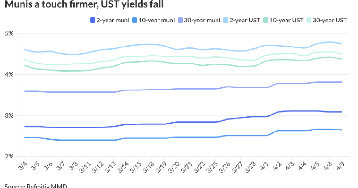 Refinitiv MMD’s scale was bumped up to two basis points: The one-year was at 3.30% (-2) and 3.09% (unch) in two years. The five-year was at 2.68% (unch), the 10-year at 2.65% (-1) and the 30-year at 3.81% (unch) at 3 p.m.