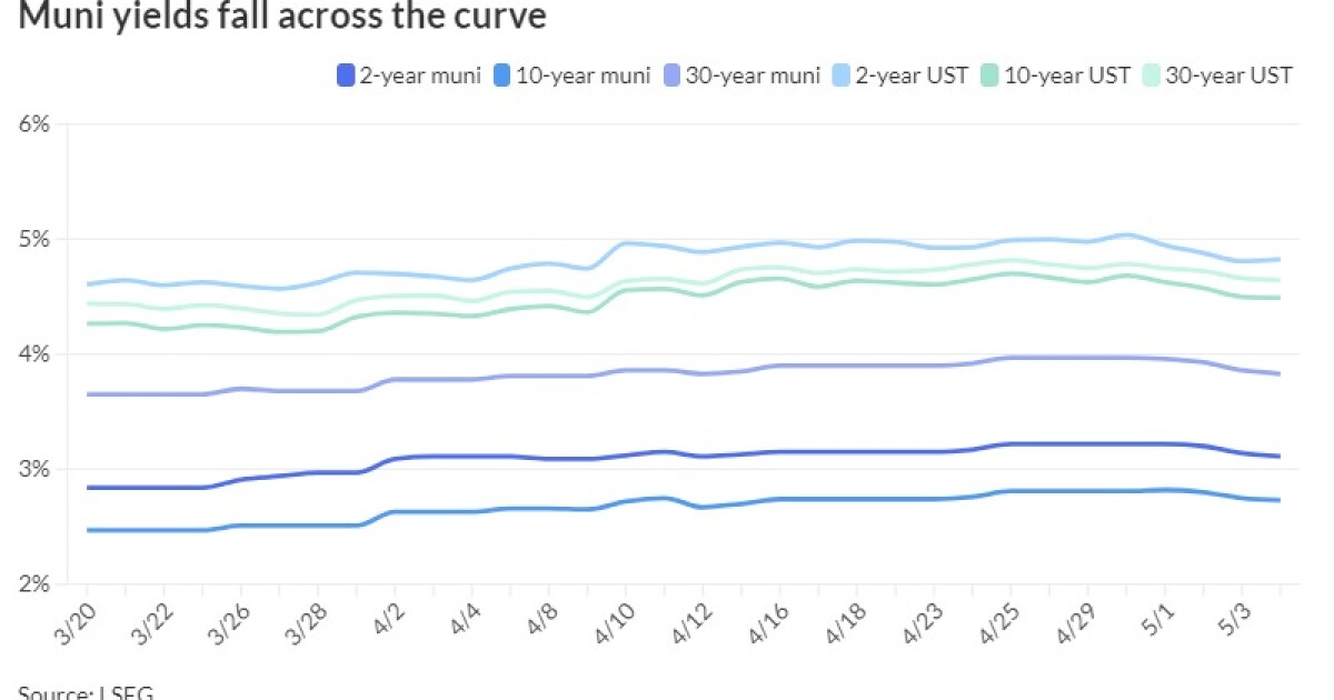 The S&P Global Market Intelligence municipal curve was bumped up to three basis points: The one-year was at 3.33% (-3) in 2025 and 3.10% (-3) in 2026. The five-year was at 2.73% (-2), the 10-year was at 2.72% (-2) and the 30-year yield was at 3.81% (-3), according to a 3 p.m. read.