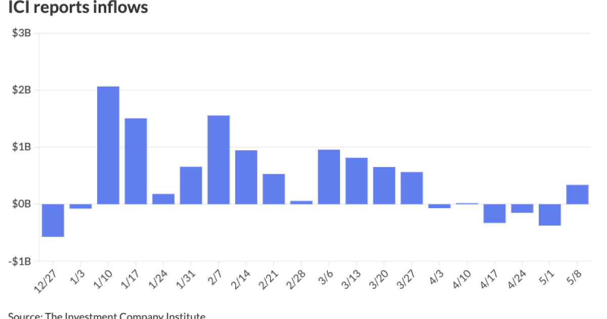 The Investment Company Institute reported inflows from municipal bond mutual funds for the week ending May 8, with investors adding $339 million from funds following $375 million of outflows the week prior.