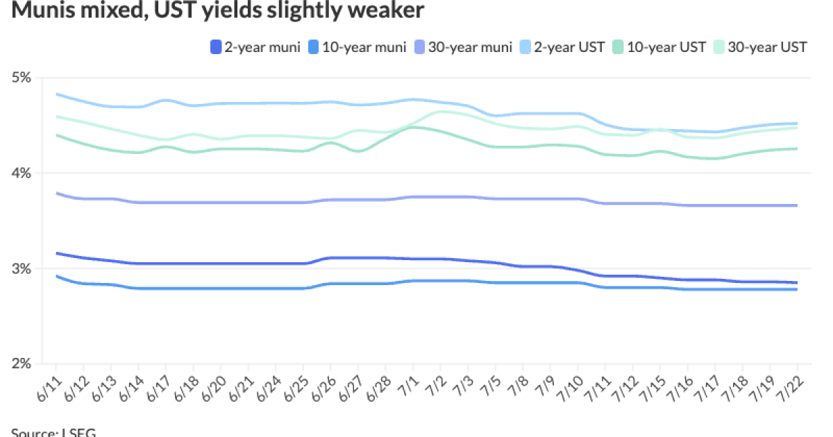 On the heels of President Joe Biden’s departure from the presidential race, munis were mixed Monday. U.S. Treasuries gave back some early gains, ending the day slightly weaker, while equities ended up.