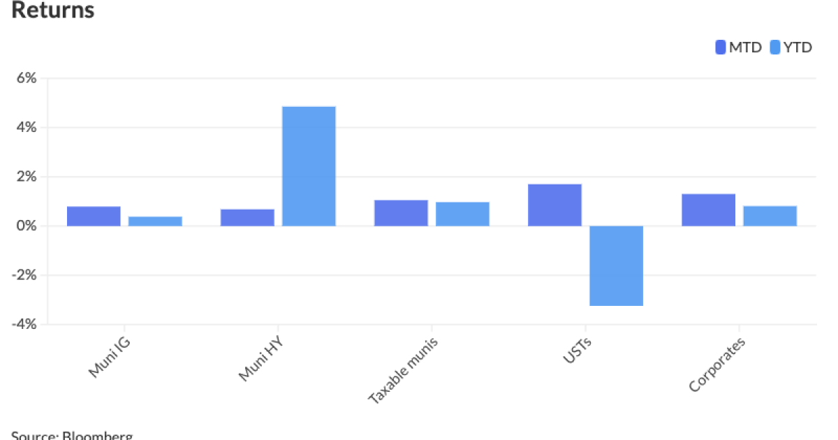 With the rally in July, munis have pushed “further into the green” with a year-to-date return of 0.38% and a month-to-date return of 0.79%, Wong said.