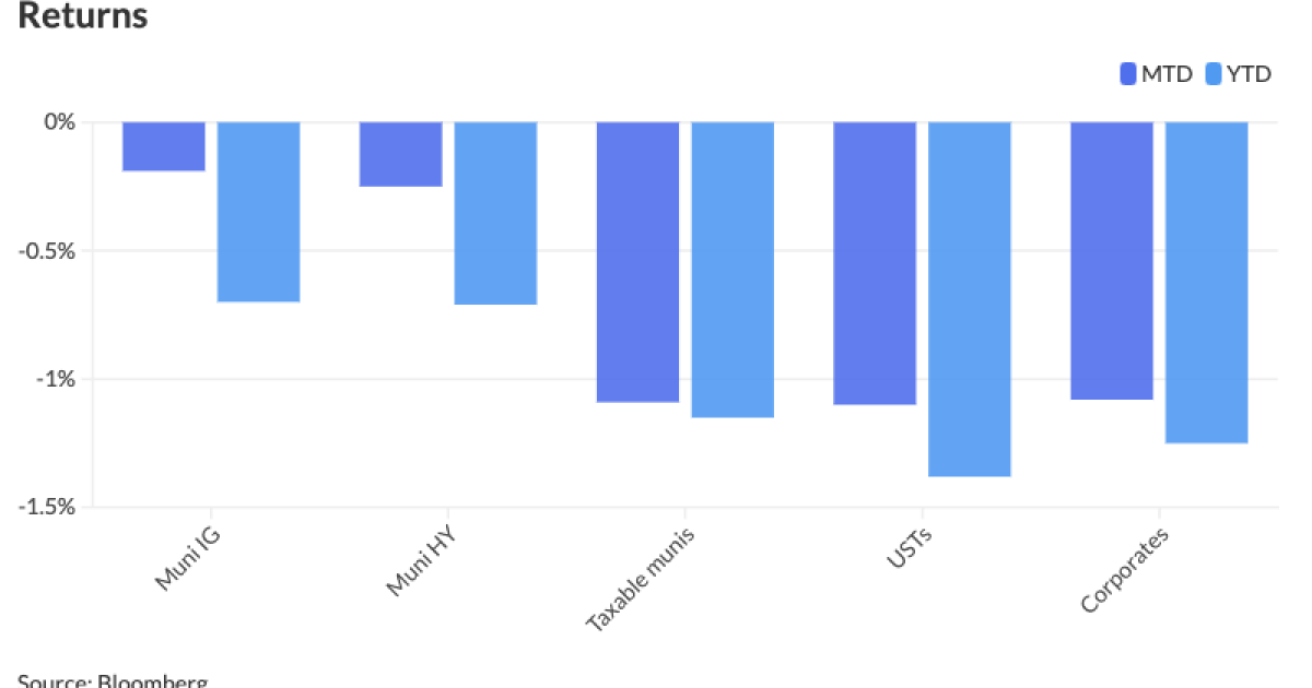 Munis are currently returning negative 0.19% month-to-date and negative 0.70% year-to-date.